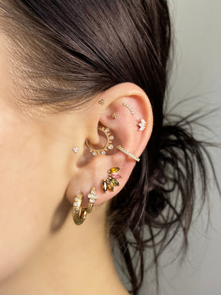 “I was gravitated toward the ear piercing & curation trend but struggled to find feminine, denim-fine, approachable luxury piercing jewelry to style the 18 piercings I have. I was dreaming of piercing jewelry that has the similar aesthetic as my fine jewelry designs. My friends, customers and retailers are sharing similar interests. Covid lockdown allows me to horn in and design and introduce an intricate, colorful & approachable piercing collection”